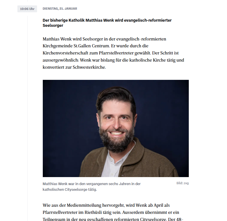 St.Gallen24.ch: «Matthias Wenk konvertiert zum evangelisch-reformierten Seelsorger» |