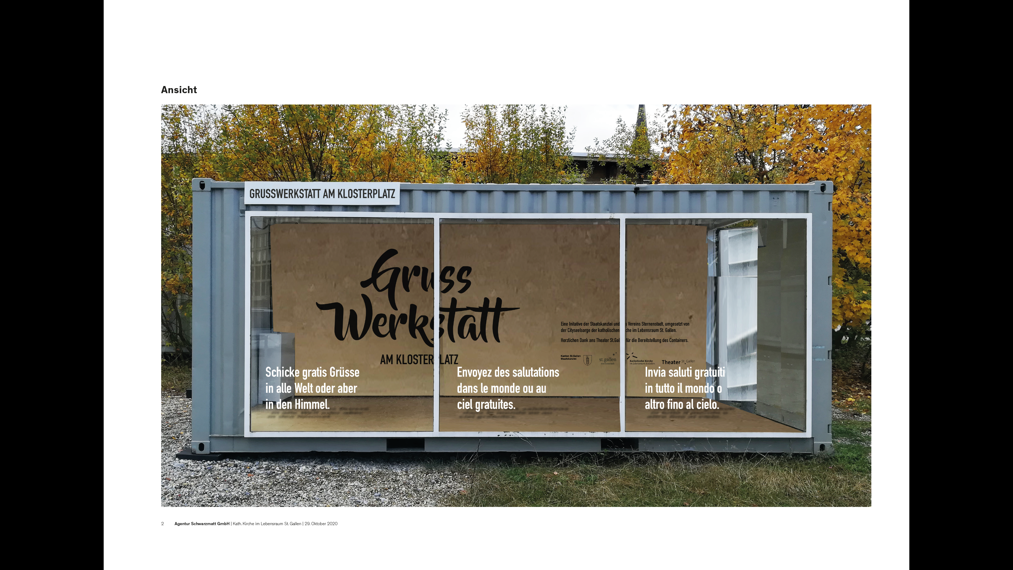 Auf Initiative des Vereins Sternenstadt entwarf die Cityseelsorge die Grusswerkstatt am Klosterplatz. Erfahren Sie die Gastfreundschaft der benediktinischen Klostertradition durch Freiwillige und Seelsorgende im Grusswerkstatt-Container und lassen Sie die weihnachtliche Stimmung des prächtigen Christbaums auf sich wirken. In dieser Stimmung lässt sich wunderbar eine Grusskarte aus St.Gallen in die Welt oder in den Himmel versenden. Die einen Karten gehen auf die Post und die Himmlischen fliessen in die Gebete unserer Gottesdienste ein.