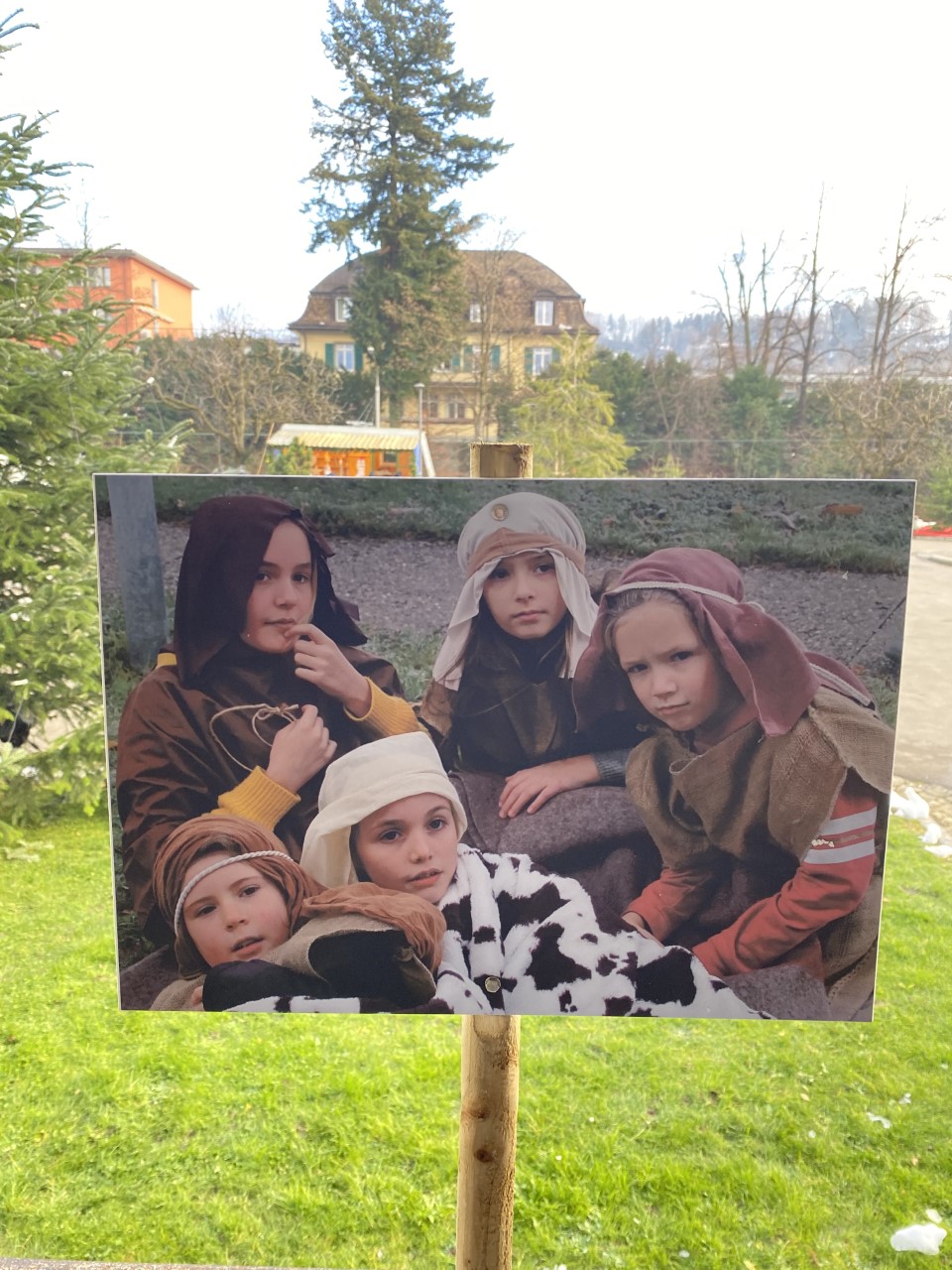 Weihnachtsgeschichte in 15 Stationen am Waltramsweg – auf dem Spazierweg zum Wildpark Peter und Paul. Verschiedene Kinder aus dem Quartier Rotmonten stellen Szenen aus der Weihnachtsgeschichte