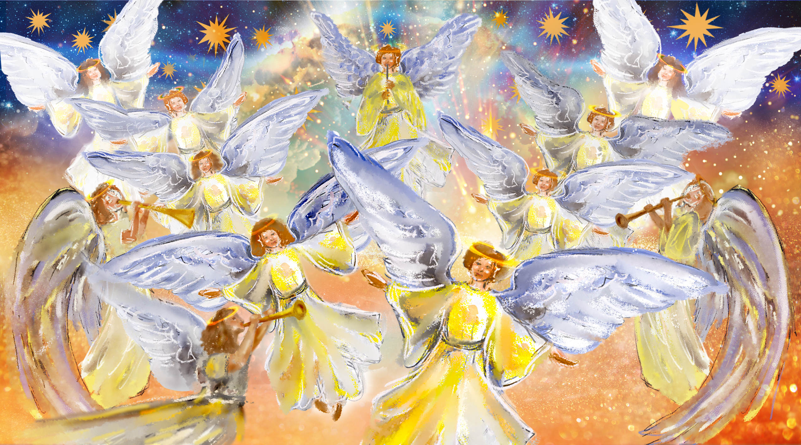 Das Bild nimmt die Symbole und Farben der Kirche wunderbar auf und entfaltet eine mystische, warme Atmosphäre. Die Weihnachtsengel können zu den oben erwähnten Zeiten sowie in den Gottesdiensten bestaunt werden. Seien Sie herzlich willkommen.